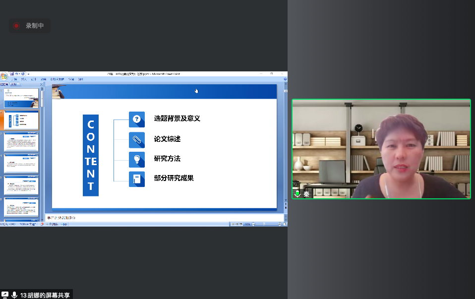 中期答辩会分研究生汇报、评审小组评价指导两个环节进行。同学们以PPT的形式就论文的进展情况进行了汇报,包括研究进度、内容、研究过程、存在问题等。评审小组对硕士生的论文进行认真的评议,并针对存在问题提出相应要求及处理意见。