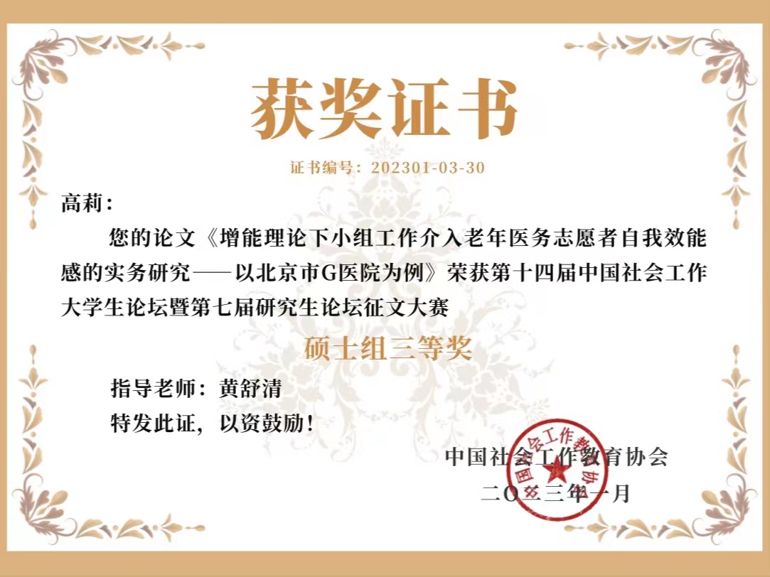 2023年1月11日-12日,第十四届中国社会工作大学生论坛暨第七届研究生论坛在线上成功举办。本次论坛由中国社会工作教育协会主办,来自全国110余所高校的400余名师生参加了本次论坛,论坛设置了1个主论坛和9个分论坛,共收到300余篇投稿,在本次论坛征文大赛中,我学部学生高莉、熊梓嘉、季麟风、江媛媛等四名学生投稿的三篇论文入选,其中学生高莉、熊梓嘉通过两轮筛选受邀于1月12日参加分论坛发言分享。