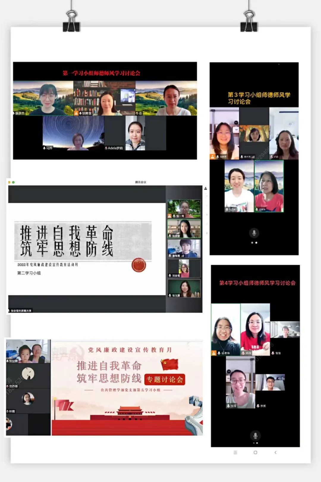 2022年5月,公共管理学部党支部按照校党委党风廉政建设宣传教育月部署开展了以“推进自我革命,筑牢思想防线”为主题的系列学习教育活动,党员个人自主学习、学习小组讨论交流和党员集中云参观相结合,分三个步骤,整零结合、循序渐进。在党员个人自主学习阶段,党员教师们认真学习了校党委下发的《习近平在十九届中央纪委六次全会上发表重要讲话》、《教育部:新时代高校教师职业行为十项准则》等15个文件。