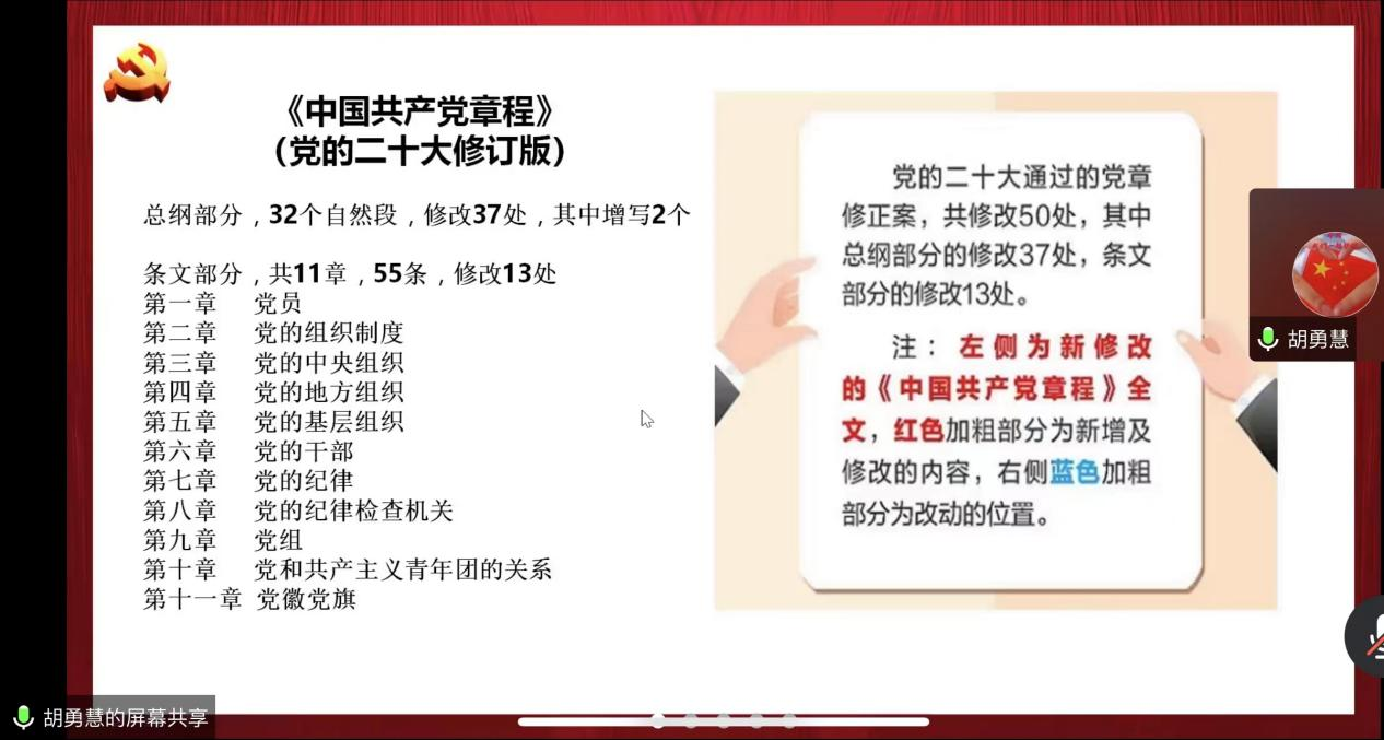 党课上,胡书记围绕“党章建设概况”、“总纲部分”、“条文部分”三个模块层层推进,采用新旧党章对比讲解、修正内容深度讲解的方式,突出党课重点,在逐步讲解中深刻阐释;作为教师党员我们不仅要深入学习二十大党章修正案,做到认认真真学,完完全全学和原原本本学,更要深植家国情怀,提升自身政治素养,做好学生榜样。