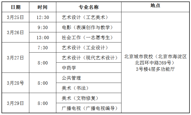 3月25日—3月29日,一志愿上线考生和调剂考生报到、体检、各培养单位组织复试。3月底—4月中旬,第二批调剂考生报到、体检、各培养单位组织复试。