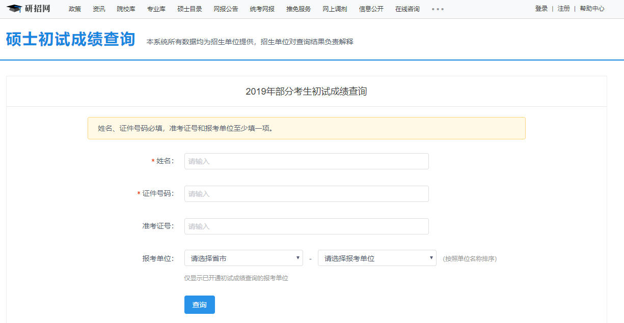 2.查询方式:登录中国研究生招生信息网成绩查询页面(具体网址为http://yz.chsi.com.cn/apply/cjcx/),根据系统要求输入相关信息后查询成绩,所需信息准考证中均能找到,查询界面如下图。