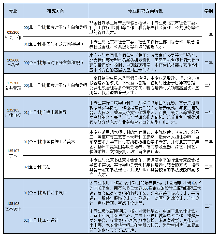 3.学制:社会工作硕士、中药学硕士、公共管理硕士学制为二年,艺术硕士的美术、广播电视、艺术设计等各领域学制为三年,全日制和非全日制学生学制相同。