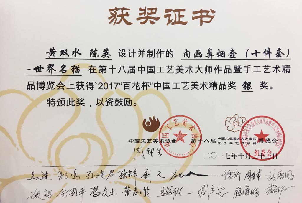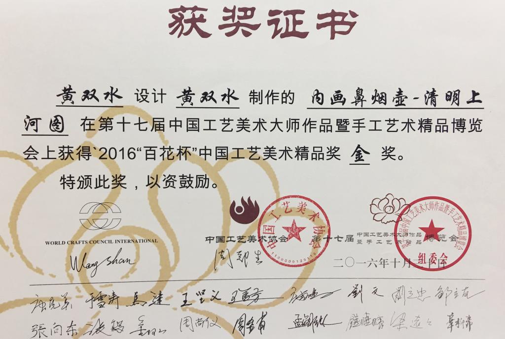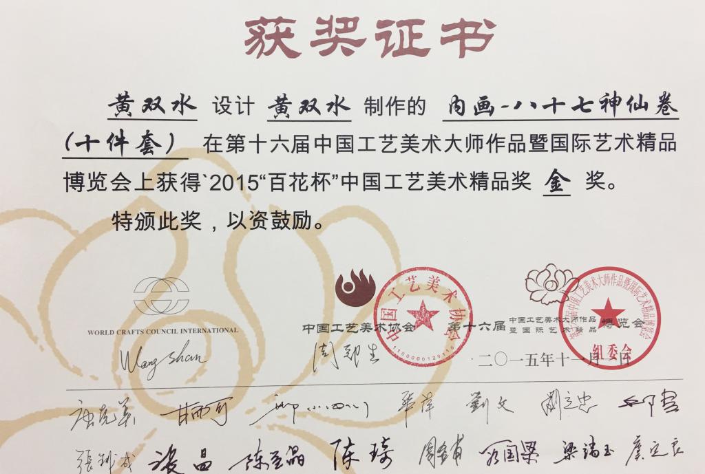2015年10月,作品《八十七神仙卷》在中国工艺美术协会举办的第十六届中国工艺美术大师作品暨国际艺术精品博览会中获得“百花杯”;