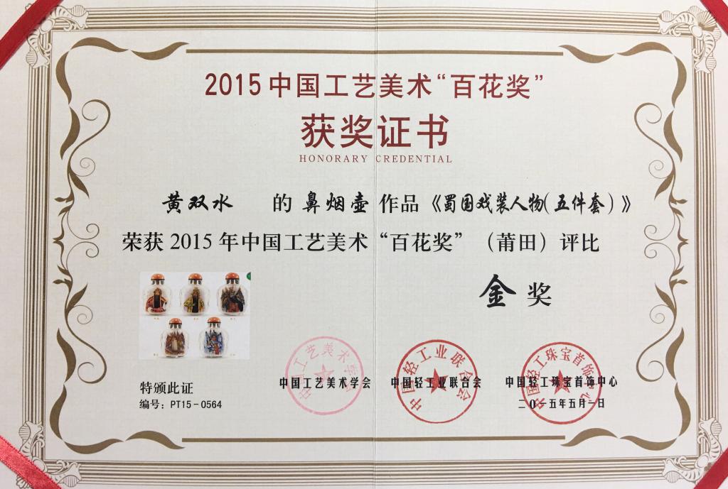2015年5月,作品《蜀国人物》在中国轻工业联合会举办的中国工艺美术“百花奖”评选中获得金奖;