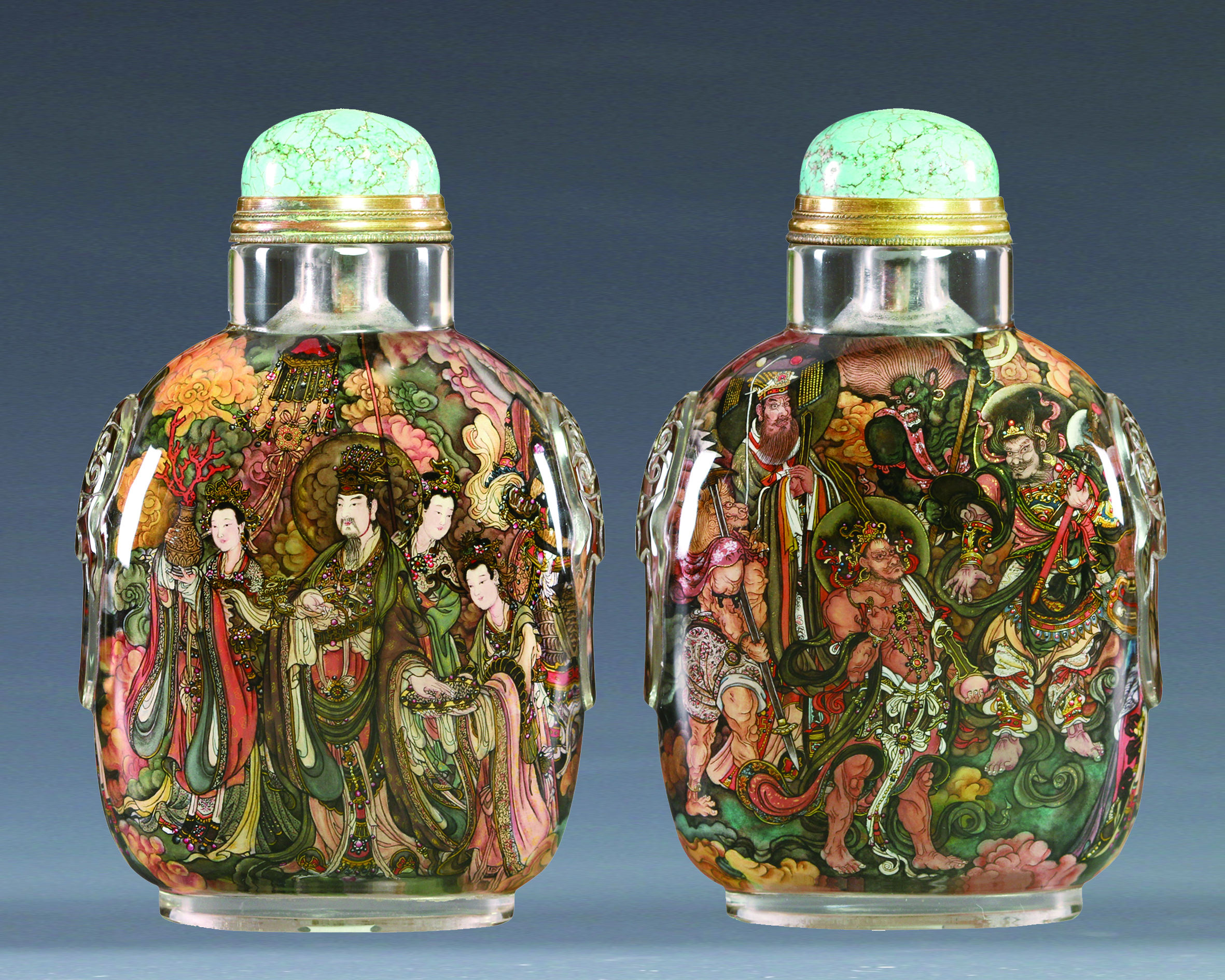 黄三老师没有一刻放弃过内画技法精益求精的追求。他游历寺庙和佛塔古迹,用心体会古人创作佛教人物造像的高超技艺,摸索千佛千面的细节变化。敦煌多种佛窟造像、北魏龙门石窟卢舍那大佛、天水麦积山石窟佛像等等,给了他丰沛的创作灵感。千禧年过后,内画艺术的材料有了巨大的变化,天然水晶、天然发晶、玛瑙等材料被大量采用,使得内画艺术呈现了百花齐放、百家争鸣的局面。天然矿物材料一方面可以大幅提升内画的保存时间,另一方面也给内画家们进行俏色创作开辟了更多的创作空间。黄三老师用了两年多的时间,精心挑选出天然水晶鼻烟壶几十只,先后创作了他的代表作品《三十三观音》、《法海寺壁画》,其中《三十三观音》在2014年世界手工艺理事会举办的国际艾琳奖评选中获得“金奖”,《法海寺壁画》2015年在京津冀非遗大赛中也斩获“金奖”。
