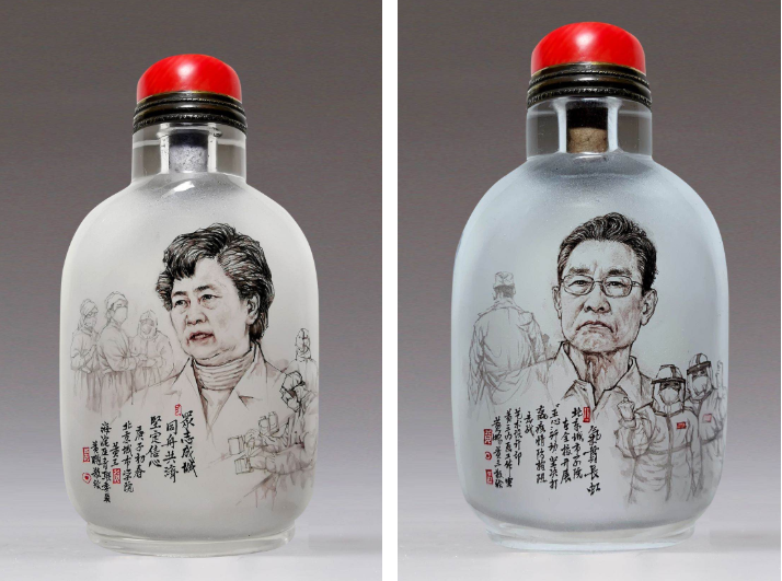 学习之路漫长又孤单,每天十多个小时的内画学习,他一坚持就是十多年。扎实的基本功,优秀的造型能力,让他的内画学习研究快速且具有成效,各项内画技艺的熟练程度都全面提升。黄三老师的代表作之一《历任香港总督肖像》,就是在这个时期完成的,他突破了鼻烟壶内壁的特效困难,自成风格的技法在这套作品中得到了完美的呈现。