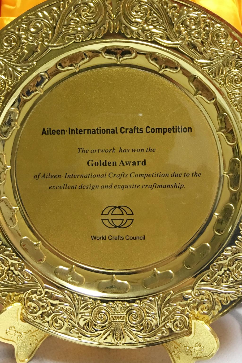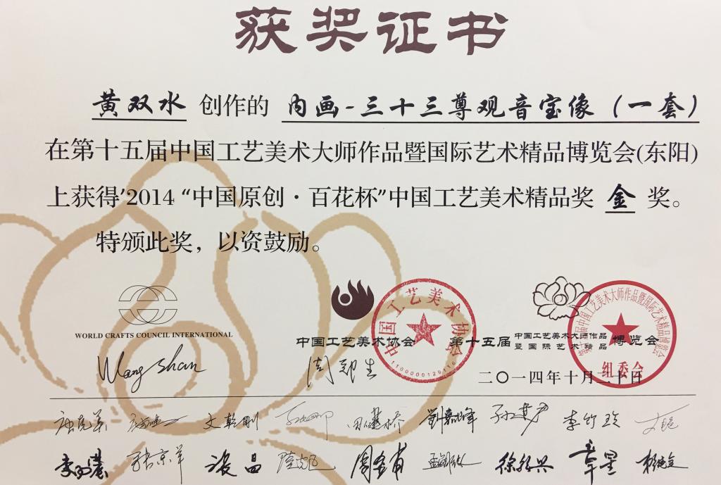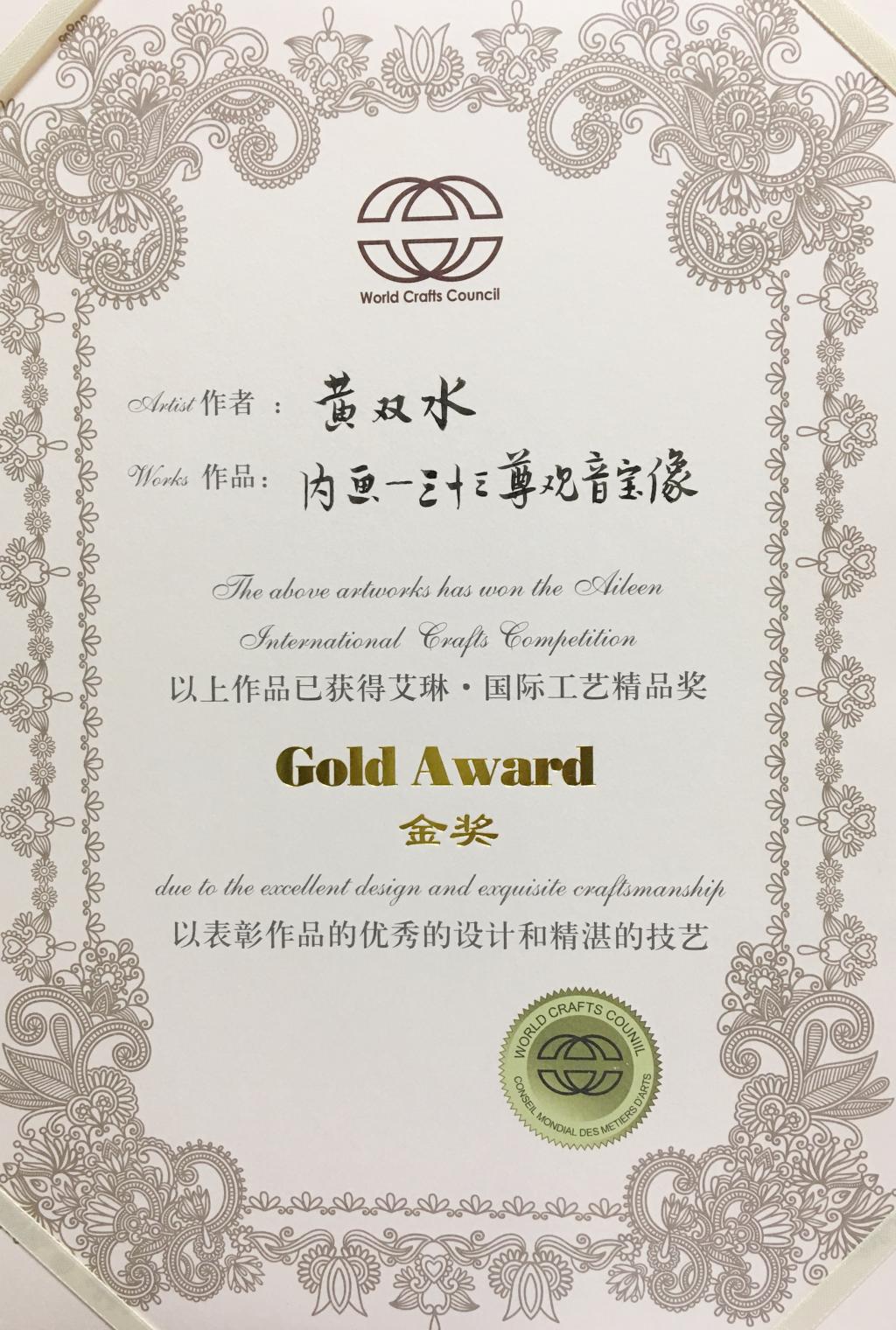 2014年10月,作品《三十三尊观音像》在世界手工艺理事会举办的“艾琳国际工艺精品奖”评选中获得金奖。