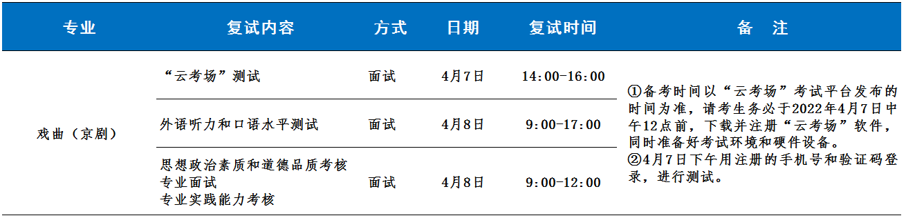 测试办法:由五名考官组成复试专家小组进行面试。首先,考生进行简短的自我介绍,重点介绍学习京剧及舞台实践等情况,考官针对考生学习背景、实践经历、科研能力等进行延展性提问;然后,由考官随机抽取题目,考生当场作答。每位考生复试时间约为15-20分钟。