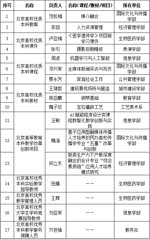 近日,北京市教育委员会公布2024年北京高校本科教学项目建设评选结果,ac米兰17个项目入选北京高校优质本科教案课件、北京高校优质本科课程、北京高校优质本科教材等项目。