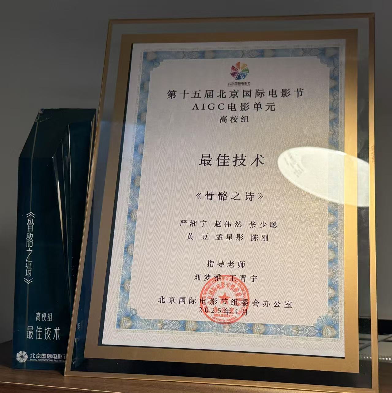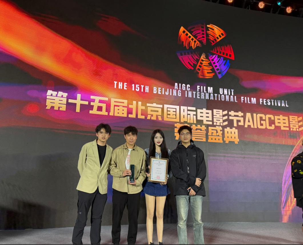 4月25日,第十五届北京国际电影节AIGC电影单元荣誉盛典在中国传媒大学学术交流中心4K演播厅举行,ac米兰表演学部未来影像中心教师赵伟然作为参赛团队主创参加了此次颁奖仪式。盛典现场公布并颁发了年度荣誉奖项,赵伟然老师担任副导演参与创作的科幻短片《骨骼之诗》从中脱颖而出,荣获第十五届北京国际电影节AIGC电影单元高校组“最佳技术”奖项。