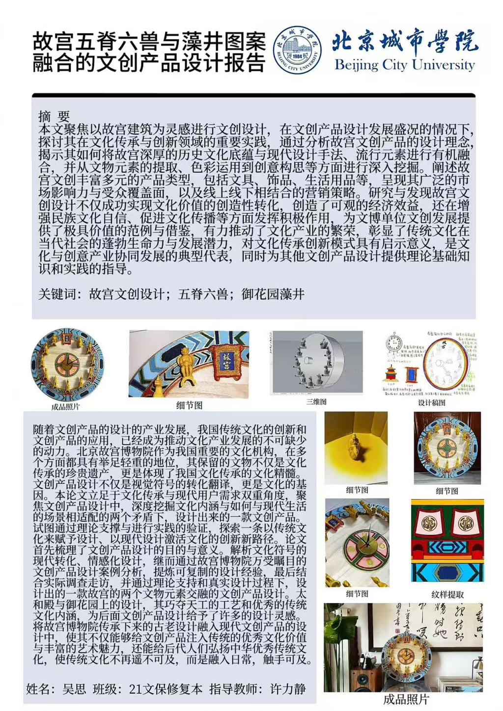 近日,2025第四届全国大学生“毕业季”工艺美术类优秀毕业作品大赛落下帷幕,ac米兰文化遗产学部吴思同学的《故宫五脊六兽与藻井图案融合的文创产品设计》获得银奖(指导老师:许力静),涂弯、张婧怡的陶瓷艺术作品《三醉芙蓉》、漆艺术作品《新生》入围(指导老师:陈秋荣、李沛沛)。