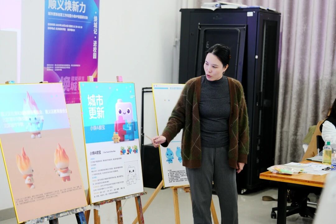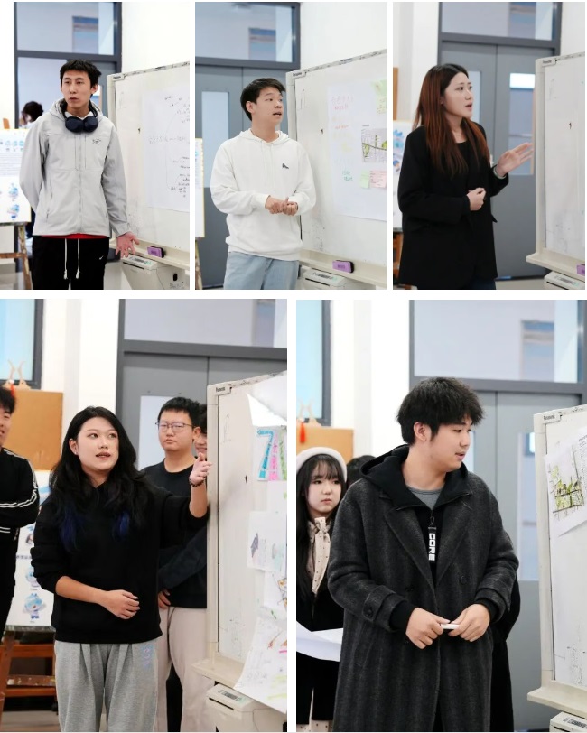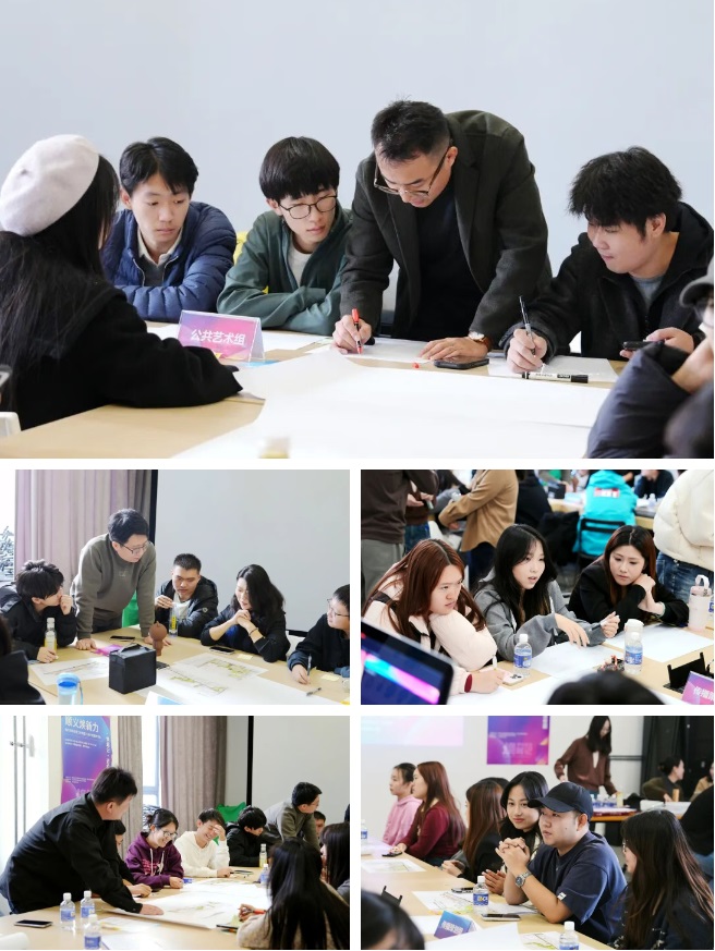 在“顺义焕新力”主题工作坊中,同学们依据专业所长,分为视觉设计组与传播策划组,在老师指导下围绕天竺体育文化街区导视系统、公共艺术设计与“小焕”IP全年传播方案展开共创。跨学科的思维在分组协作中激烈碰撞、充分交融。