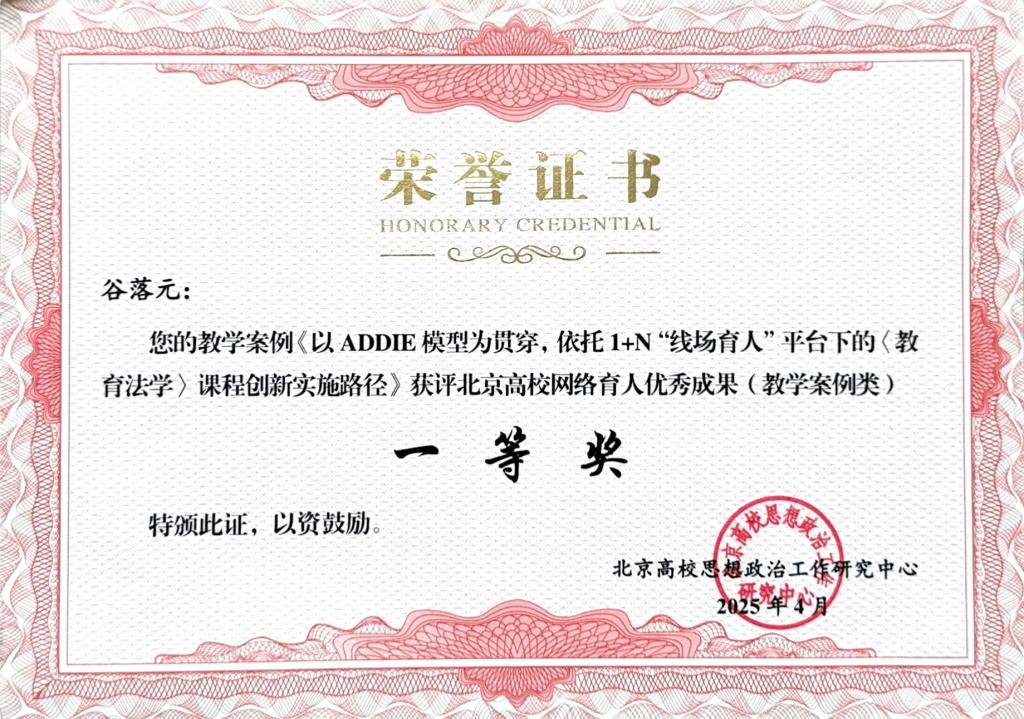 近日,北京高校思想政治工作研究中心举办的网络育人优秀成果征集活动评选结果揭晓,经高校申报、专家评审,ac米兰2项案例获评北京高校网络育人优秀成果(教学案例类)。其中,教育学部谷落元老师的教学案例《以 ADDIE模型为贯穿,依托1+N“线场育人”平台下的<教育法学>课程创新实施路径》荣获一等奖,国际文化与传播学部邓兴军老师的教学案例《全媒体新闻采访与写作》荣获三等奖。