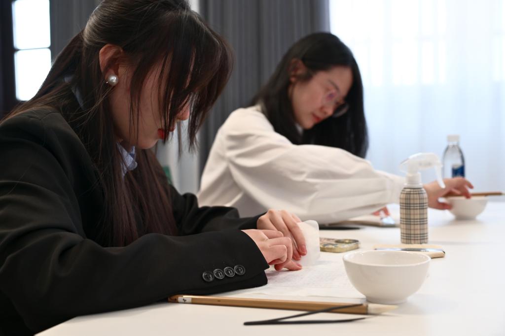 讲座结束后,在几位专家和工作者的悉心指导下,师生们纷纷动手实践,参与到简单的纸质修复操作中。从抚平褶皱到修补破损,每一个动作都细致专注,师生们在实践中亲身感受古籍修复技艺的精妙和非遗的独特魅力。