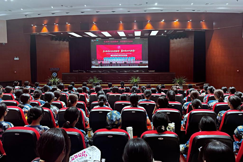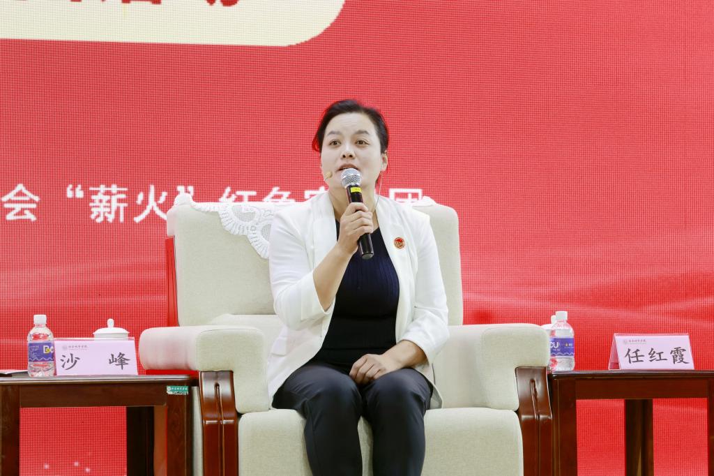 任红霞饱含热泪进行发言。一位普通的母亲把丈夫和五个儿子送上前线,他们全部战死沙场,这个故事悲壮而真实地印证了“兵民是胜利之本”。