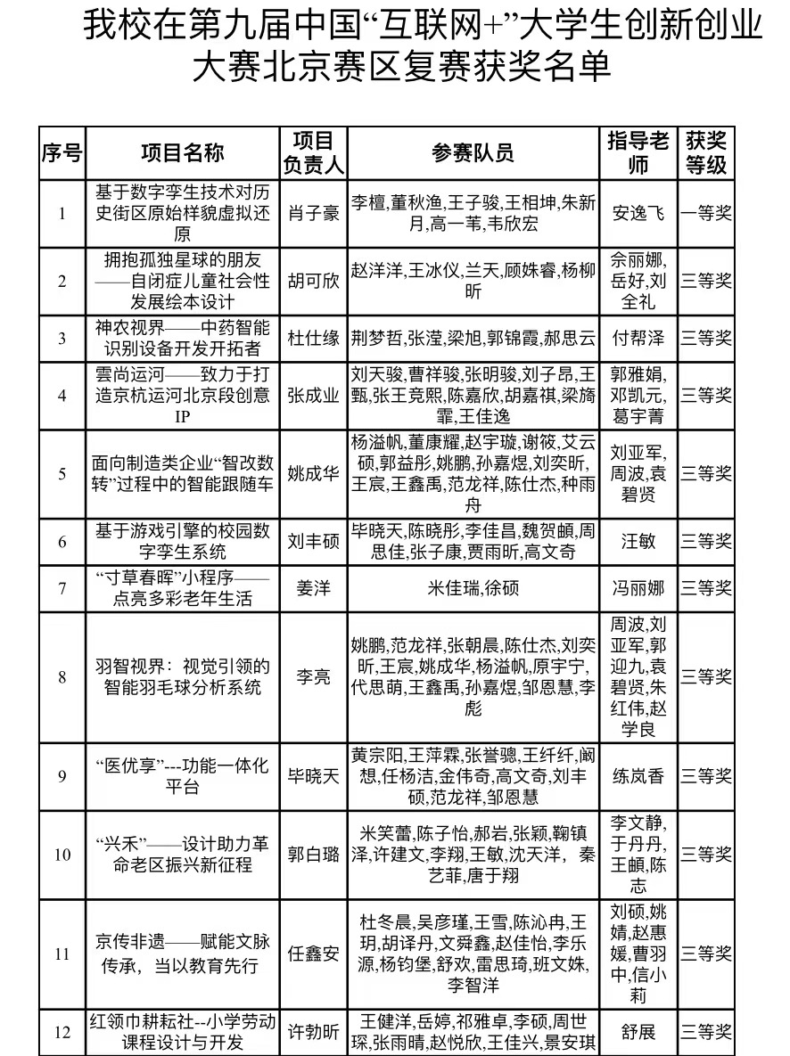 近日,第九届中国国际“互联网+”大学生创新创业大赛北京赛区获奖公示结束,ac米兰获得1金11铜的好成绩,并因赛事组织工作出色荣获“优秀组织奖”。
