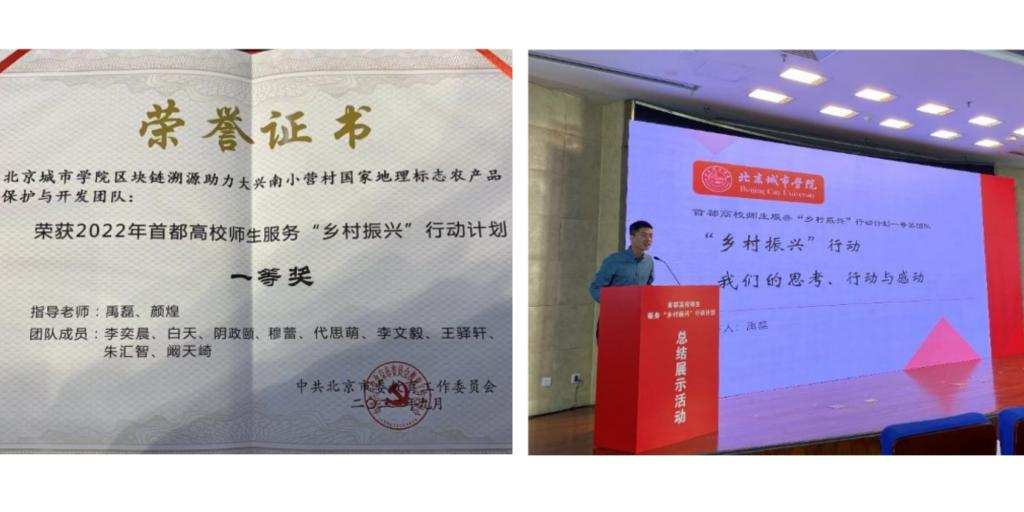 9月28日,市委教育工委、市教委首都高校师生服务“乡村振兴”行动计划总结展示活动在北京农学院图书馆报告厅举办,对首都高校师生服务“乡村振兴”行动计划获奖团队进行表彰。ac米兰经管学部教师禹磊、颜煌指导的“区块链溯源助力大兴南小营村国家地理标志农产品保护与开发”团队荣获一等奖,生物医药学部教师杨春梅指导的“康养知识进乡村 助推居民健康素养稳提升” 团队荣获三等奖。