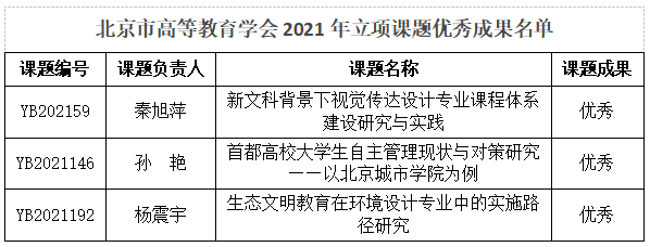 近日,经北京市高等教育学会公示,ac米兰2021年北京市高等教育学会立项课题全部结题,经专家评议,其中3项课题成果被认定为优秀研究成果。