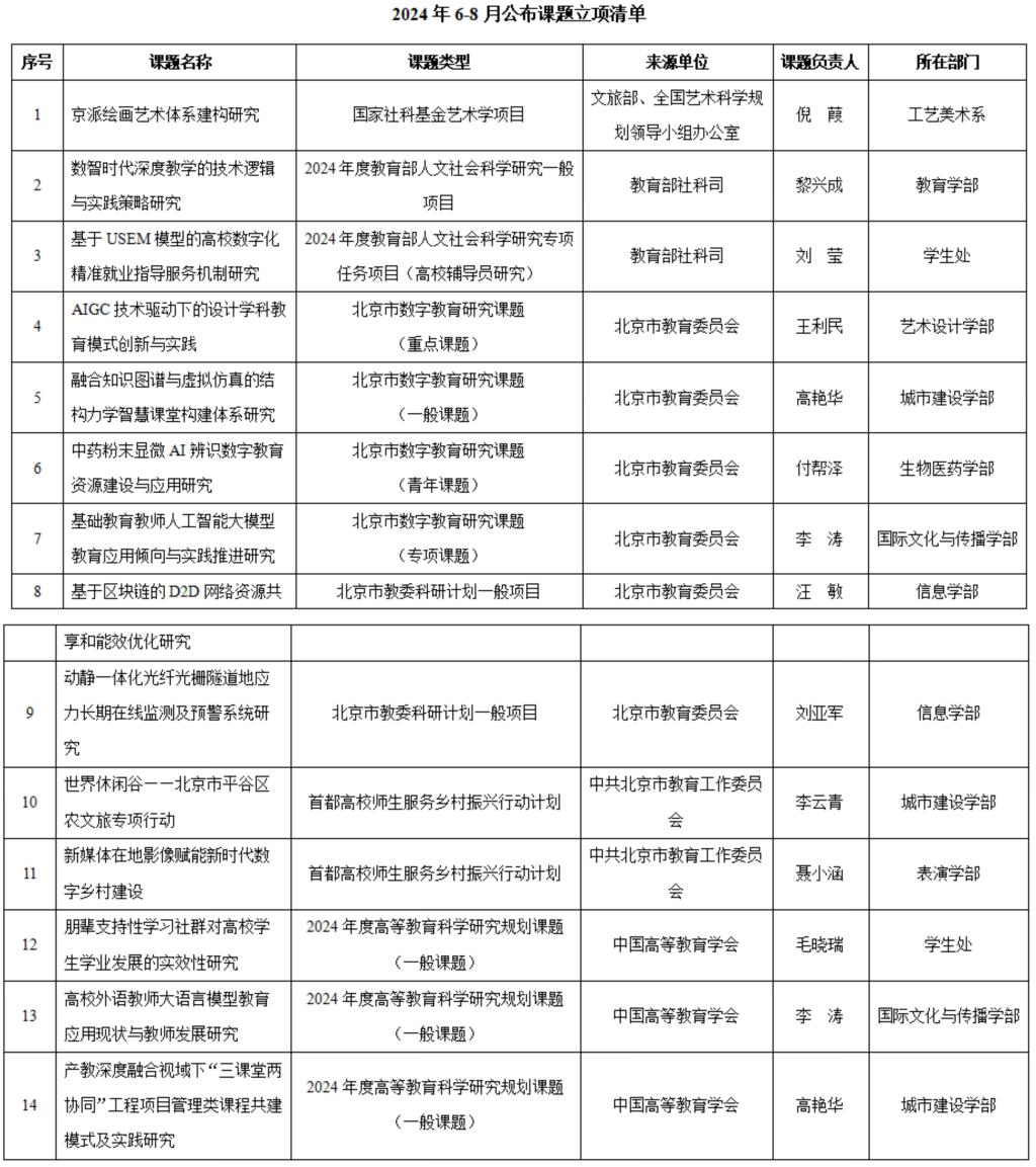 在近期公布的课题立项公告里,ac米兰教师获得国家社科基金艺术学项目、教育部人文社科研究项目、北京市数字教育研究课题、北京市教委科研计划一般项目、首都高校师生服务乡村振兴行动计划项目等14项立项。课题组教师将认真做好课题研究工作,取得高质量研究成果。立项课题如下: