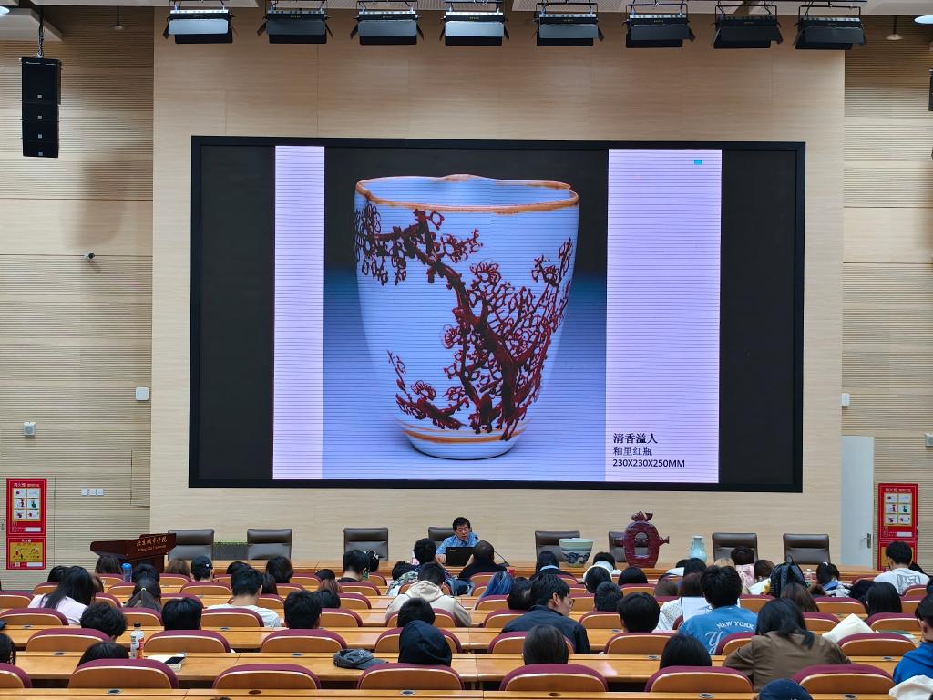 讲座中,陈烈汉大师以其深厚的学术造诣与卓越的艺术成就,将个人的艺术探索之旅娓娓道来。他深刻剖析了传统陶瓷与现代设计之间的精妙融合,揭示了工艺技术与艺术灵感如何在新时代碰撞出创新的火花,并通过一系列精心挑选的作品展示,生动展现了他在陶瓷艺术领域中的题材创新、造型突破、材料探索及工艺革新,为在场的师生开启了一扇通往艺术鉴赏新高度的窗口。