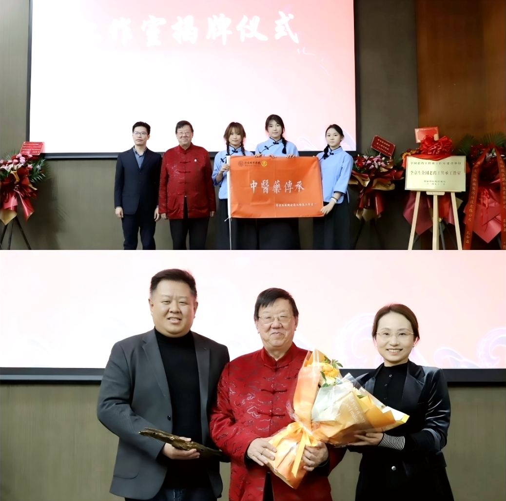 在揭牌仪式环节,李德娟与田培源共同为“李京生全国老药工传承工作室”揭牌。随后,举行了师承班授旗仪式,由李京生教授向学员代表授旗,象征着中医药技艺的代代相传。与会嘉宾向李京生教授献花,多家企业和医疗单位送来鲜花,共同表达对老一辈中医药人的崇高敬意。