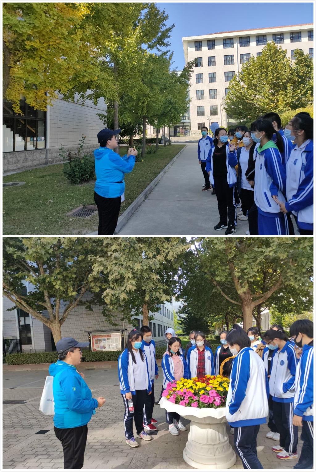 在吴丽平老师带领下,同学们在校园中做生物考察