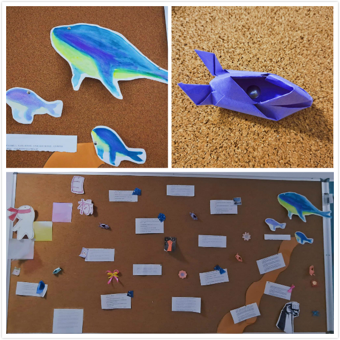 制作感言:因为这次的主题是⽬标,所以我们设计了⼀条道路,意味着⼈⽣的道路,延伸⾄远⽅。每隔⼀段路会有⼀些⽬标名⾔名句,激励着我们前⾏。路的尽头是星⾠鲸⻥,就像我们畅游在知识的海洋。⽽板报⼤体就是名⾔名句,说明我们的⼈⽣会有不同的⽬标。我分别在板报上粘贴了“⼩兔鞋”意味着我们需要⾃⼰脚踏实地,⼀步⼀步奔向⽬标。⽽标题涉及就是我们⼀步⼀步⾛向⽬标。还有⼀些其他代表着奋⽃的⼩图画,也是给我们满是“奋⽃”的板报增加⼀些⼩趣味。