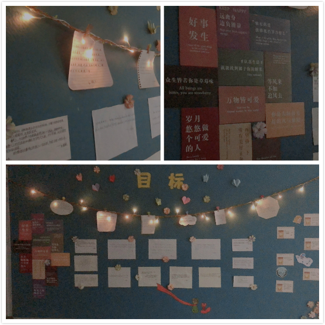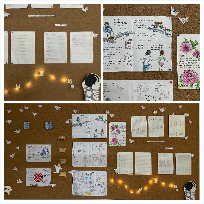 制作感言:这次板报的背景我们选⽤了⼀种绿⾊墙纸----梵⾼绿,因为绿⾊是⼀种⻘春且充满⽣机活⼒的颜⾊,也表明了⻘春正是为⽬标⽽奋⽃的时刻。板报上的花表现的是在奋⽃过程中⼀个个精彩画⾯,在绿⾊的背景衬托下有这⼀张张学⽣对于⽬标的理解,和⾃⼰的⽬标,藤蔓上的灯光就好⽐海上⼤雾中的灯塔指引奔向成功的路…板报的左下⽅有⼀处类似以俄罗斯⽅块的布置⽅法所拼出的激励话语,也是为了呼应“⽬标”这⼀主题。