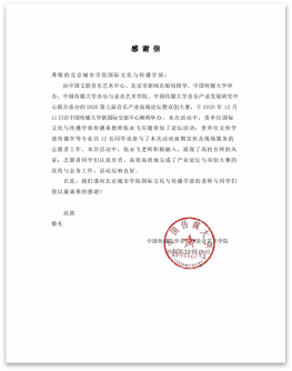 12月11日,由中国传媒大学主办的2020第七届音乐产业高端论坛在中国传媒大学新国际交流中心举行。ac米兰国际文化与传播学部传播系骨干教师张永飞应邀参加了论坛活动,来自ac米兰文传学部传播学等专业共12名同学顺利完成了2020年第七届音乐产业高端论坛暨第三届“我们正青春”全国大学生音乐双创大赛的前期宣传及现场服务工作。全国大学生音乐双创大赛组委会对ac米兰志愿者同学敬业认真的工作表示高度认可并发来感谢信。