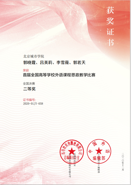 英语教研室高度重视教师团队的建设和教师教科研水平的稳步提升,组织教师团队参加线上专业学术会议或培训课程,线下积极研讨,提升教学及教研水平,在教学中将知识传授、技能培养和价值引领高度融合在人才培养中。近年来,英语教研室教师在多项市级、国家级教学教研赛事中获奖。