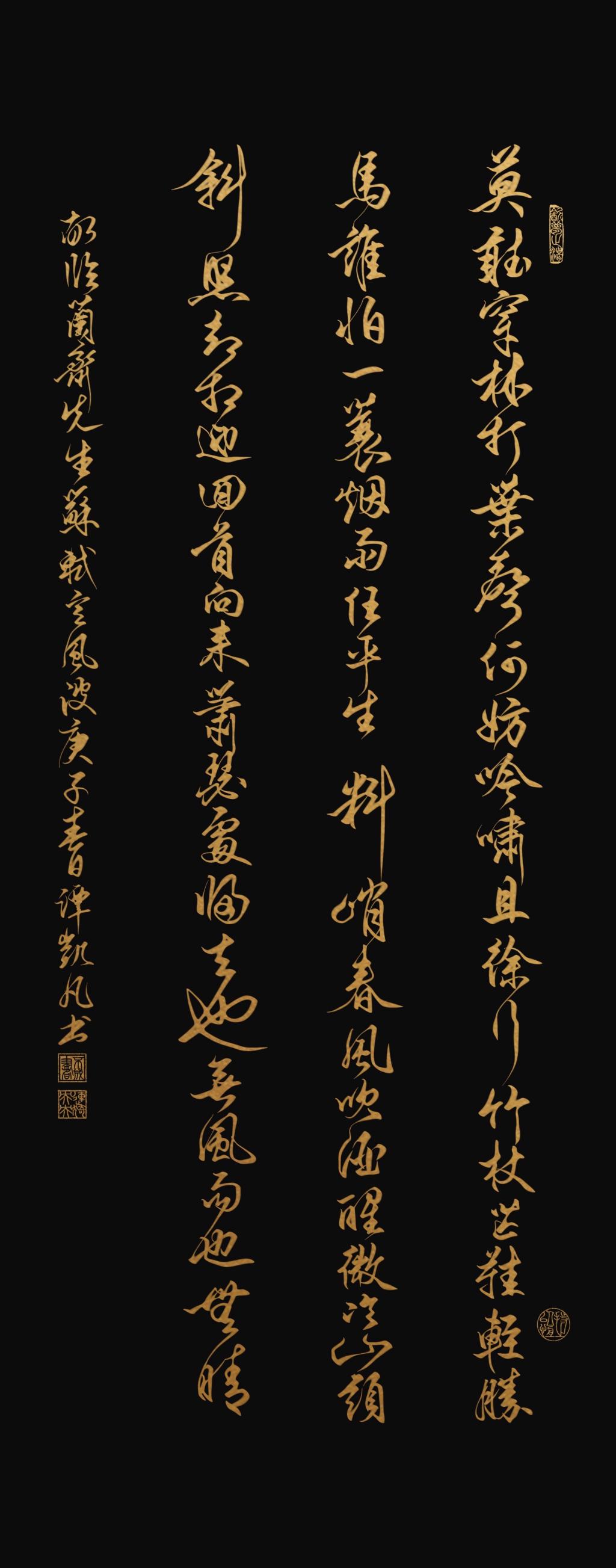 《定风波》是苏轼词中最富盛名的一首。通过野外途中偶遇风雨这一生活中的小事,于简朴中见深意,于寻常处生奇景,表现出旷达超脱的胸襟,寄寓着超凡脱俗的人生理想。上片着眼于雨中,下片着眼于雨后,此足征是翁坦荡之怀,任天而动。琢句亦瘦逸,能道眼前景,以曲笔写胸臆,倚声能事尽之矣。临写此篇时,我也力求深刻体会词中深意,赋予笔墨中。