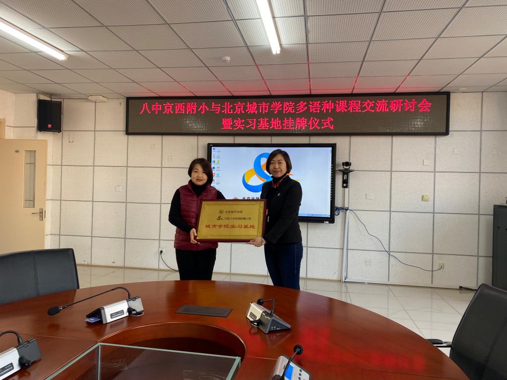 12月25日,文传学部赴北京市第八中学京西附属小学开展多语种课程交流研讨会,并隆重举行实习基地挂牌仪式。文传学部于2020-2021学年秋季学期派出德语、法语、西班牙语专业2021届优秀毕业生参与八小的小语种课程教学活动,学生通过实习不仅锻炼了语言综合应用能力,还提升了教学方法、课堂管理等教育教学能力。