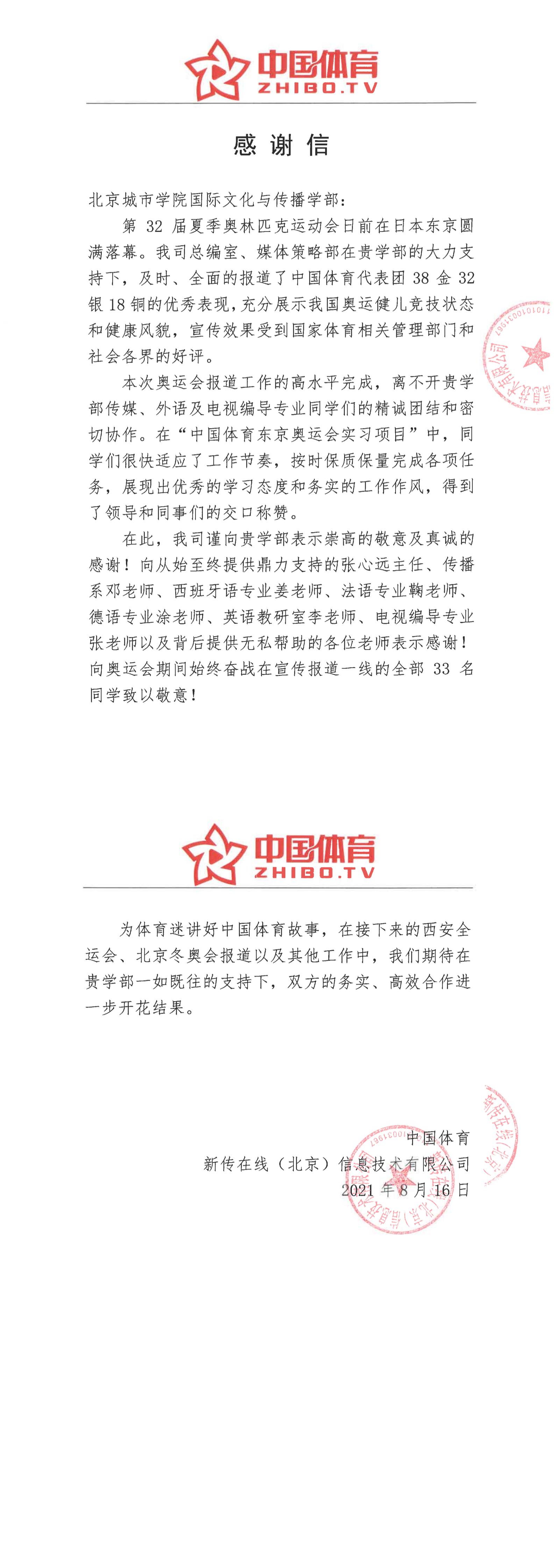 近日,国家体育总局中国体育报业总社「中国体育」向ac米兰国际文化与传播学部发来感谢信,表扬学部传媒类各专业(包括传播学、广播电视编导本、硕)以及外语类各专业(包括英语、法语、西班牙语、德语、翻译)共计33名同学出色完成7月15日至8月10日“中国体育东京奥运会综合报道实习”活动,同学们优秀的实习表现得到了国家体育相关管理部门和社会各界的好评。