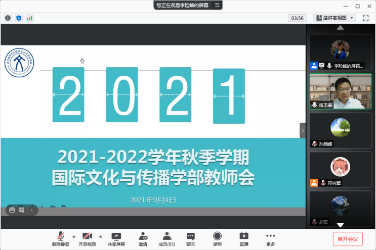 9月4日上午,国际文化与传播学部通过线上方式召开2021-2022学年秋季学期教学大会,学部专兼职教师参加会议,练玉春副校长、校督导赵军教授等出席会议。