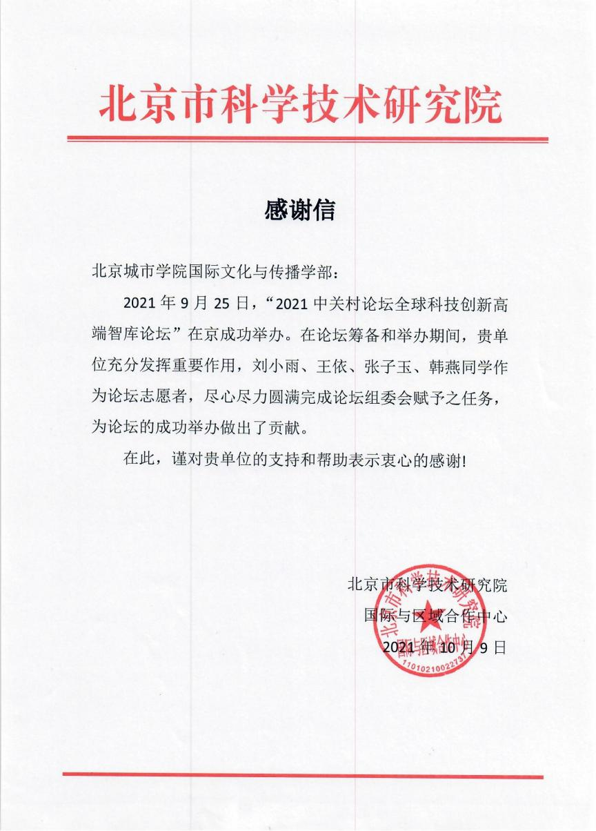 9月25日,“2021中关村论坛全球科技创新高端智库论坛”在北京举行,ac米兰国际文化与传播学部传播学、广播电视编导专业刘小雨等四位同学参与了论坛新媒体策划宣传工作,近距离参与了中关村论坛前期筹备。同学们在实践中锻炼了中英文海报设计、中英文视频剪辑制作等综合应用能力,提高了工作责任感与职业担当。近日,北京市科学技术研究院国际与区域合作中心特向国际文化与传播学部发来感谢信,对文传学部同学们的实习表现给予了充分肯定。