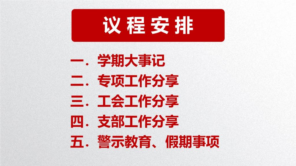 本次大会分为五个篇章:学期大事记、专项工作分享、工会工作分享、支部工作分享和警示教育及假期事项。