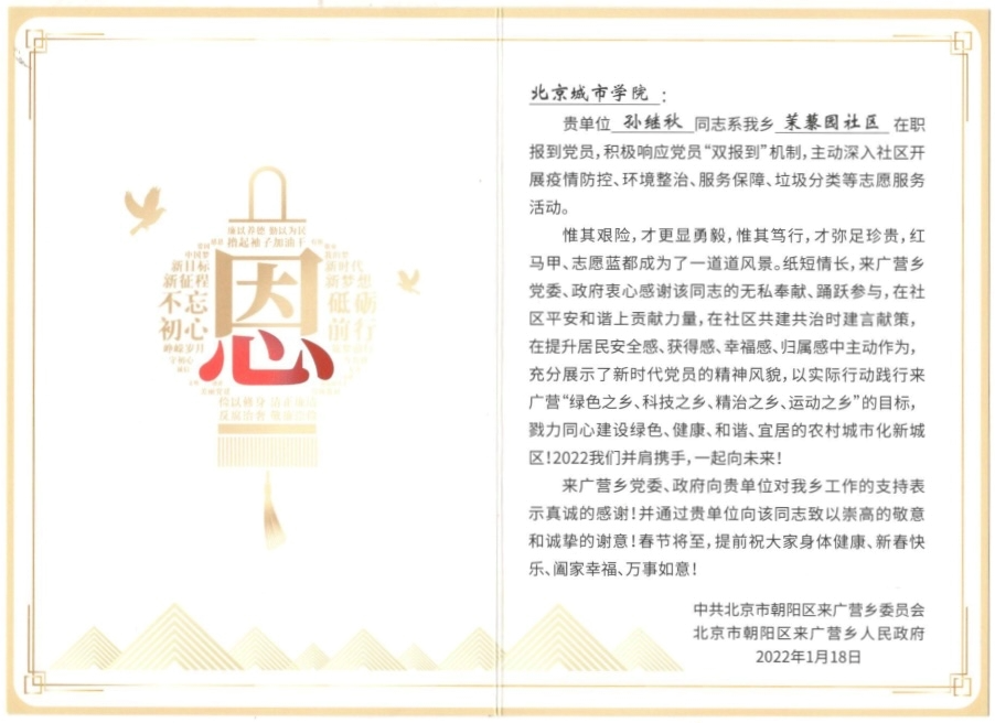 近日,学部收到中共北京市朝阳区来广营乡委员会、北京市朝阳区来广营乡人民政府发来的一封表扬信。国际文化与传播学部党支部党员孙继秋同志积极响应党员“双报到”机制,主动深入茉藜园社区各项志愿服务,得到了乡党委、乡政府的高度肯定,并对其无私奉献、踊跃参与的精神进行了高度赞扬。信中也对ac米兰表示真诚的感谢,朴素真挚的话语让我们倍感暖心与欣慰。