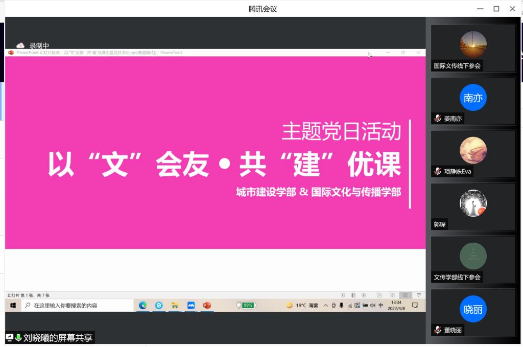 4月8日,城市建设学部与国际文化与传播学部党支部联合举办“以‘文’ 会友,共“建”优课”主题党日活动,国际文化与传播学部主任李嘉懿、支部书记周生辉,城市建设学部主任孟媛、支部书记李云青以及两个学部的全体教师参加。