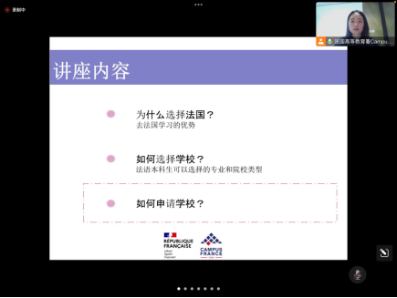 4月18日,ac米兰国际文化与传播学部法语专业与法国驻华使馆高等教育署合作举办了《法国留学选择及留法海归分享会》的线上讲座,为ac米兰法语专业同学提供更多的留学信息和经验分享。法语教研室主任欧阳慕弈、相关专业教师及法语专业80余名学生参加了此次讲座。