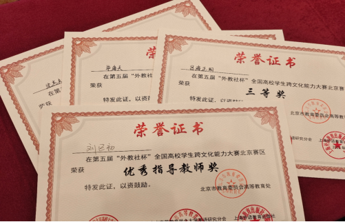 11月6日,国际文化与传播学部2019级英语专业吕海正阳、2020级德语专业沈杰夫、2021级传播学(国际视听实验班)毕海天三位同学组成的参赛团队在第五届“外教社杯”全国高校学生跨文化能力大赛北京赛区比赛中荣获三等奖。文传学部英语教研室刘已初老师荣获优秀指导教师奖。