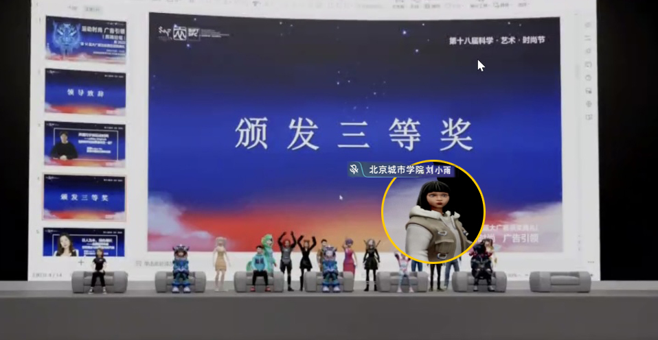 其中,传播学专业学生何欢、胡子辰、刘小雨作为学生代表及获奖者参与了“运动时尚 广告引领”高端论坛及北京赛区颁奖典礼,并以虚拟人物的形象上台领取了一等奖、二等奖和三等奖。