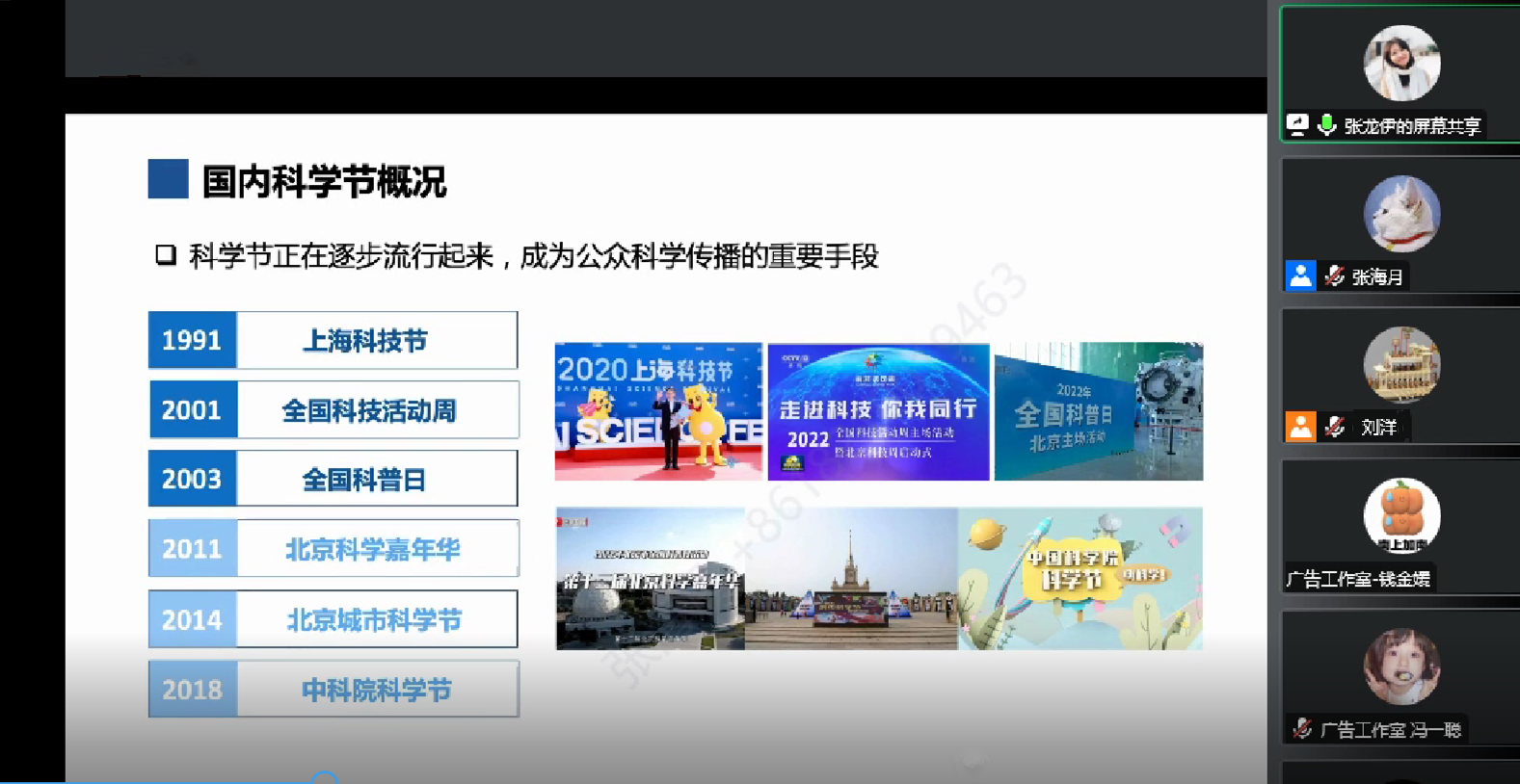 张老师从历史沿革的角度介绍了科学节在中国的兴起与发展,通过列举典型案例讲述了科学节的意义和在国内外的普及情况;围绕国内外科学节的组织背景、公众定位、资源渠道、运营模式、活动主题等多个维度,进行了对比分析。