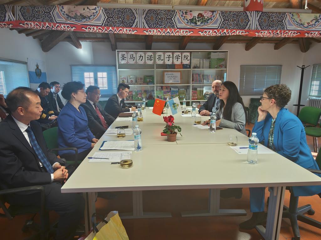 在孔院理事长布里尼奥尼,中方院长郭晓霞及外方院长文图里尼的陪同下,贾贵德应邀会见了圣马力诺教育部长安德里亚·贝鲁齐以及圣马力诺大学总干事比佐基,积极评价了他们在各自领域对孔院工作的支持,并向他们提出再接再厉的希望。