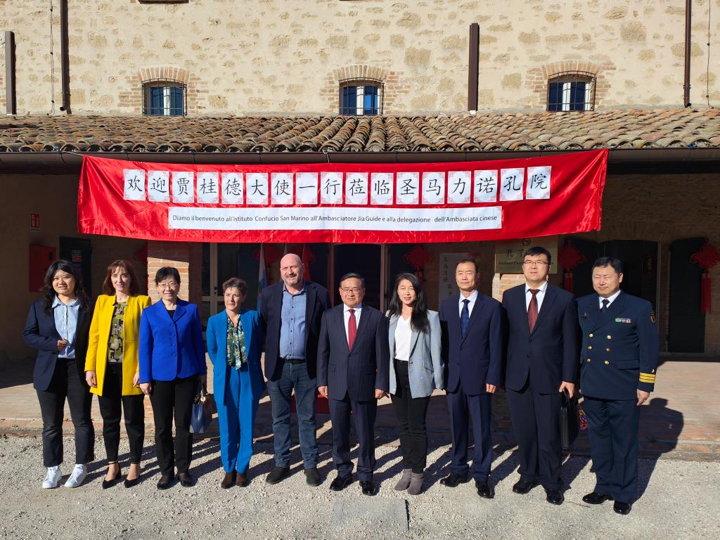 当地时间3月22日,中国驻意大利大使兼驻圣马力诺大使贾桂德在郑璇公使、张彦宇参赞、于兴国参赞、李大毅副武官等的陪同下访问圣马力诺孔子学院并指导工作。