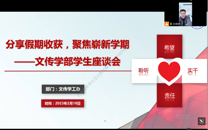 2月10日,国际文化与传播学部学工办线上组织召开“分享假期收获,聚焦崭新学期”师生座谈会,学工办主任潘冬梅、骨干教师刘斌、于澍以及十余名不同年级专业的学生代表参加,刘斌主持。