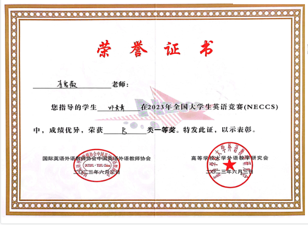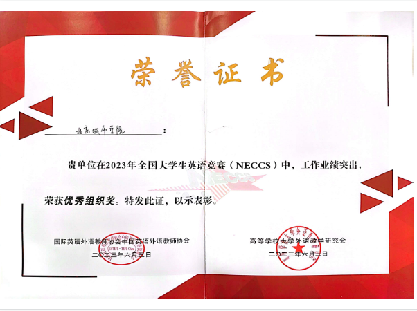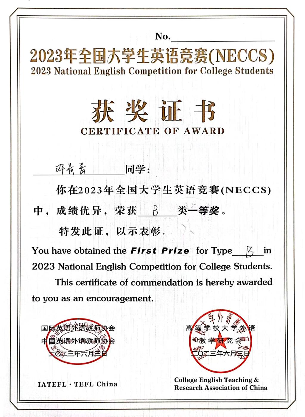 近日,文传学部英语专业学生参加了2023年全国大学生英语竞赛并斩获佳绩。2020级英语本4(商务英语)邓青青同学以优异的成绩获得B类比赛北京赛区一等奖。