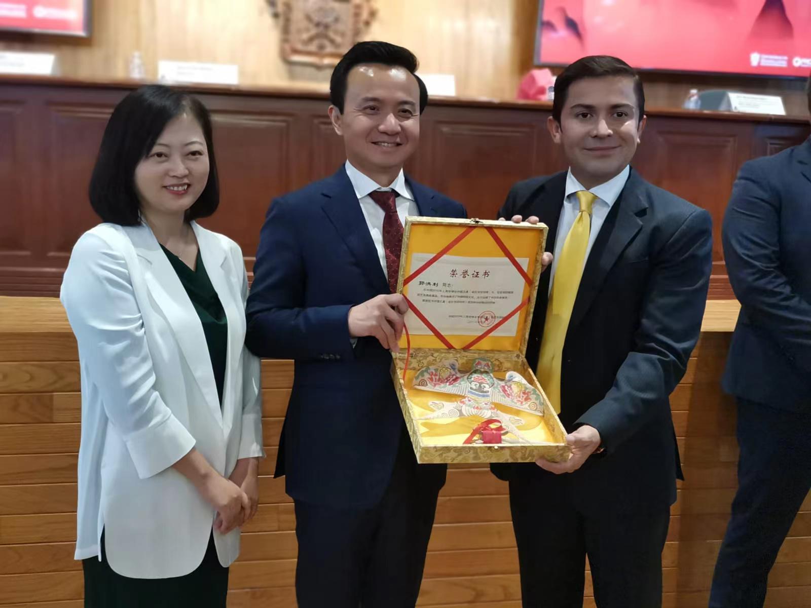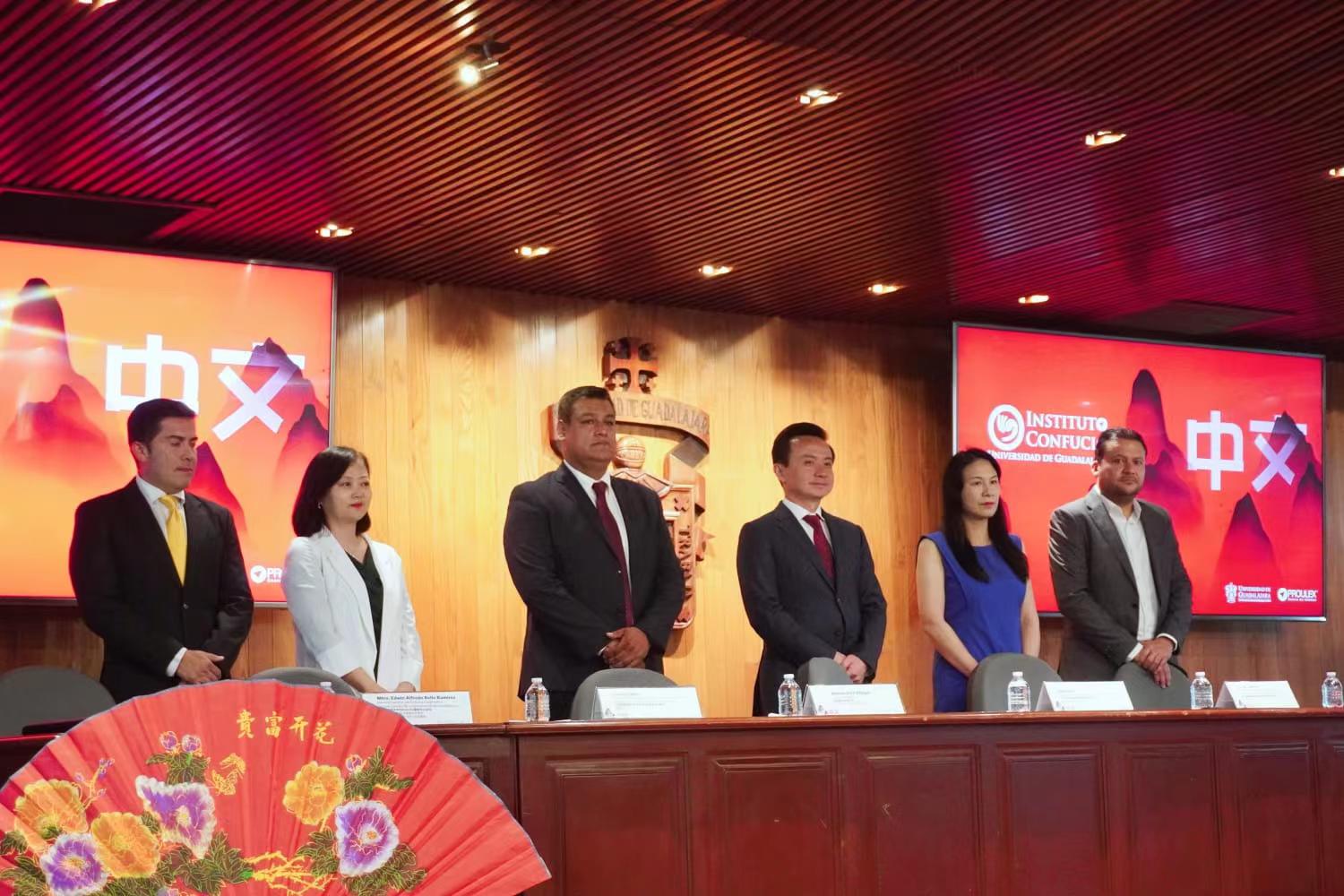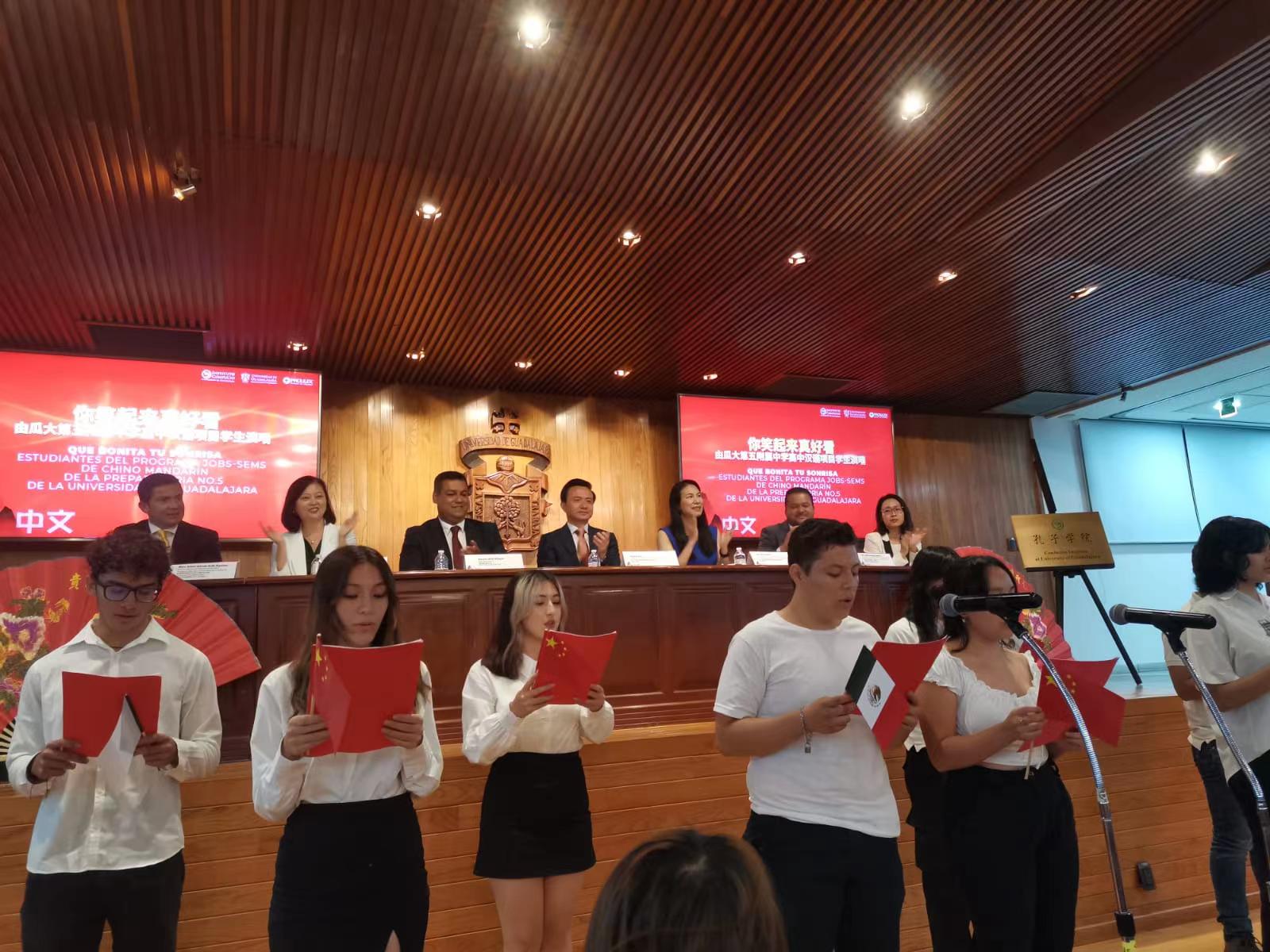 会谈后,张润大使一行走进瓜达拉哈拉大学附属高中部的礼堂,与来自13所附属中学的汉语学生和瓜达拉哈拉大学孔子学院本年度的奖学金获得者见面,并为学生们开讲新学期第一课。张润大使回顾了中墨两国交往的历史渊源以及当今时代下中墨青年加强语言与文化相互学习与交流的重要性,提出“读万卷书 行万里路”的殷切希望,赢得了学生们热烈掌声。在互动环节,来自瓜达拉哈拉大学附属五中的8名高中生表演了中文歌曲《你笑起来真好看》,并向大使赠送了亲手制作的小礼物。
