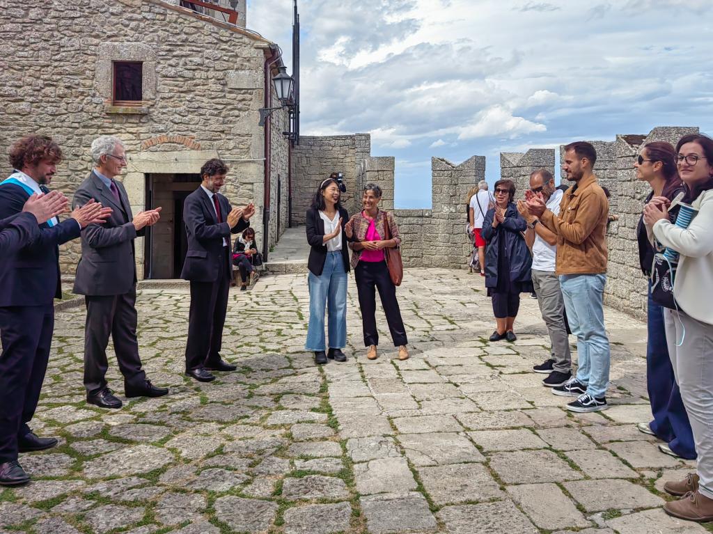圣马力诺驻华大使达里奥•加拉西(Dario Galassi)、圣马力诺市市长托马斯•罗西尼(Tomaso Rossini)及城堡委员会官员等出席活动。各国游客对书法显示出浓厚兴趣,纷纷尝试,写下“中圣友好”字样,用中国笔墨画下圣马力诺的山川。