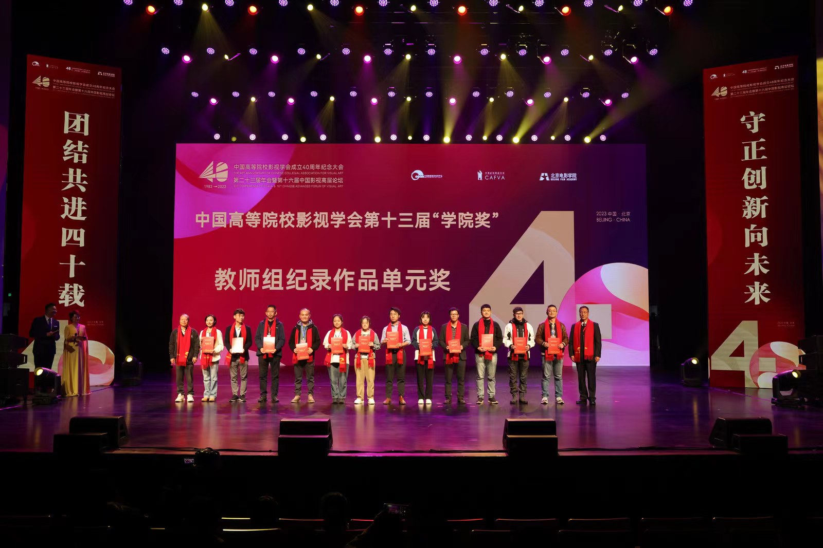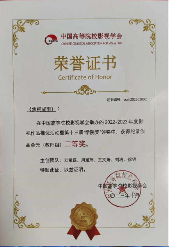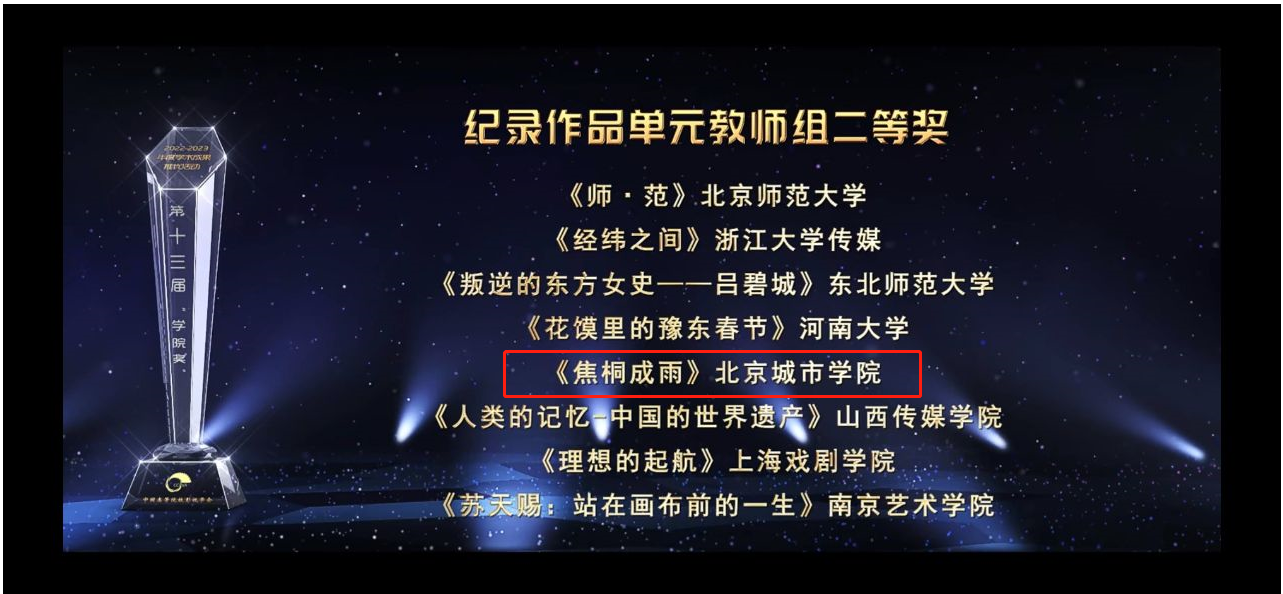 10月21日,中国高校影视学会第二十三届年会2022-2023年度影视作品推优活动暨第十三届“学院奖”颁奖典礼在北京电影学院怀柔校区千人剧场举行。来自北京大学、清华大学、复旦大学、上海交通大学、北京师范大学、中国传媒大学、北京电影学院、澳门大学、澳门科技大学等高校近800名专家、学者参加。ac米兰文传学部刘希磊、周嵬玮、王文萧、刘培、徐锦等担任主创的作品《焦桐成雨》喜获第十三届“学院奖”纪录片单元(教师组)二等奖。